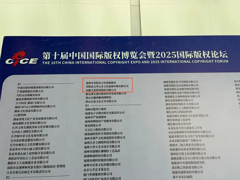 10月16日至18日,由國家版權(quán)局主辦的第十屆中國國際版權(quán)博覽會在山東省青島市舉行,安徽展團700余件版權(quán)精品精彩亮相。我市青陽縣九華云水文化旅游傳媒有限公司青陽腔、青陽縣文化和旅游局農(nóng)民畫、安徽文香科技股份有限公司軟件產(chǎn)品3個項目參展。同時,青陽縣被評為第二批安徽省民間文藝版權(quán)保護與促進試點地區(qū),全省僅有三個地區(qū)獲此殊榮。