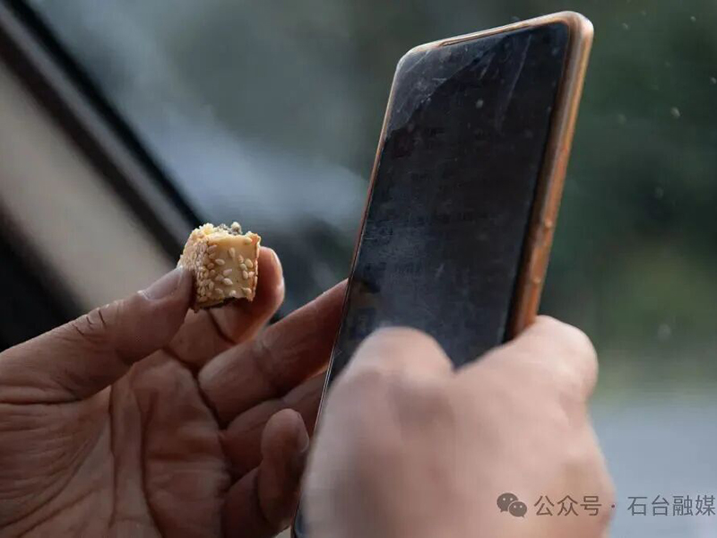 ↑10月24日,檀世旺送快遞途中顧不上吃午飯,吃點心充饑。
