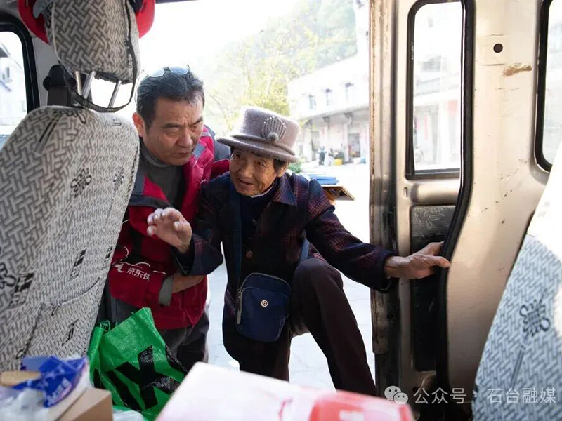 ↑10月24日,檀世旺在配送快遞途中,捎帶一位老人回家。