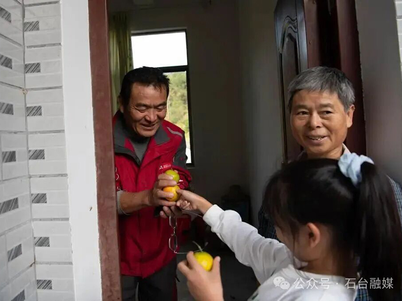 ↑10月24日,村里小朋友將桔子送給檀世旺品嘗。