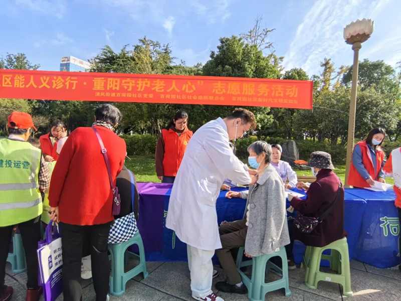 10月24日上午,池州市貴池區(qū)清風(fēng)街道百荷園社區(qū)新時代文明實踐站在百荷步行街廣場開展“社區(qū)能人義診行·重陽守護(hù)老人心”志愿服務(wù)活動?;顒觾?nèi)容為:免費(fèi)血壓測量、眼科檢查、中醫(yī)問診、口腔咨詢、聽力篩查等。