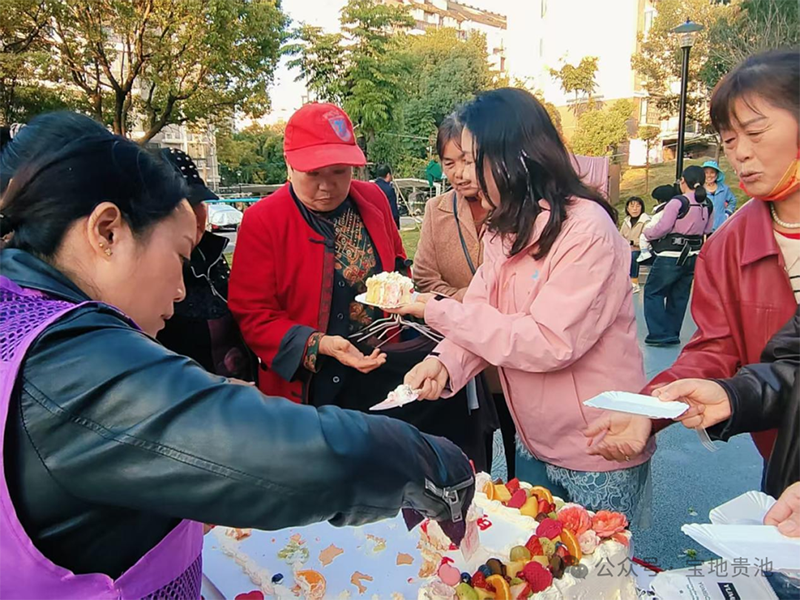 套圈游戲過后,社區(qū)志愿者捧著一個(gè)重陽蛋糕走來,切開后將一塊塊甜蜜的蛋糕逐一送到居民手中。大家手捧著蛋糕,你一口我一口分享著,香甜的味道在舌尖散開,歡樂的氣息在廣場(chǎng)上蔓延。