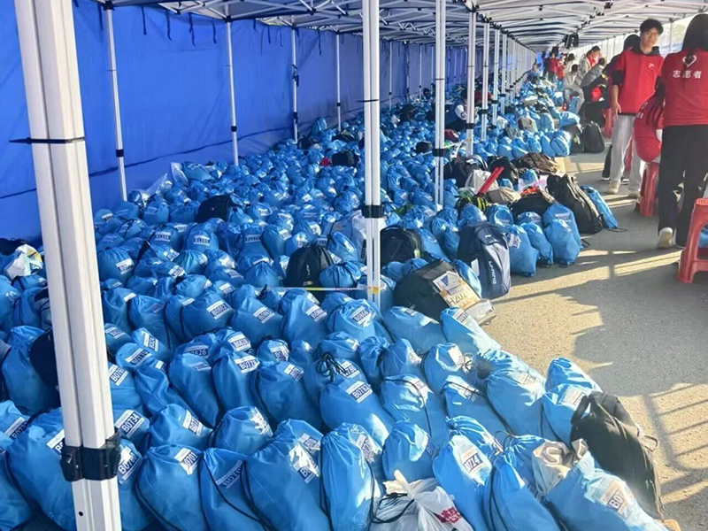 7時許,物資存放區(qū)率先“熱”了起來?!案魑贿x手,請注意!抓緊時間,存包檢錄區(qū)就在后方?!备咭衾壤锏奶崾韭晞偮?,選手們便有序涌向指定存包區(qū)域。來自池州職業(yè)技術學院的志愿者們立刻上前,雙手麻利地接過包裹,登記信息、封裝打包、分類存放一氣呵成,口中還不停傳來暖心鼓勁:“加油呀!祝你們跑出好成績!” 溫暖的笑容、高效的服務,讓選手們倍感親切。宣城跑友黃萍萍一邊遞包一邊點贊:“早就聽說池州人熱情,昨天領參賽包時就有體會,今天志愿者的服務更貼心!”