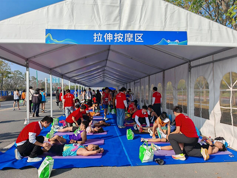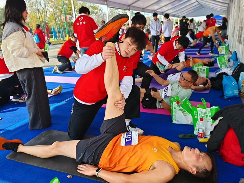 當半馬、全馬選手陸續(xù)沖過終點,拉伸區(qū)的志愿者立刻行動起來?!皝?,正面朝上躺好放松,我?guī)湍憷煲幌拢 ?志愿者們俯下身,用專業(yè)手法為疲憊的選手按摩放松,每一次用心按壓都換來了跑者真誠的 “謝謝”。這片暖意融融的區(qū)域,不僅是賽后恢復的 “充電站”,更給整場賽事畫上了圓滿溫暖的句號。